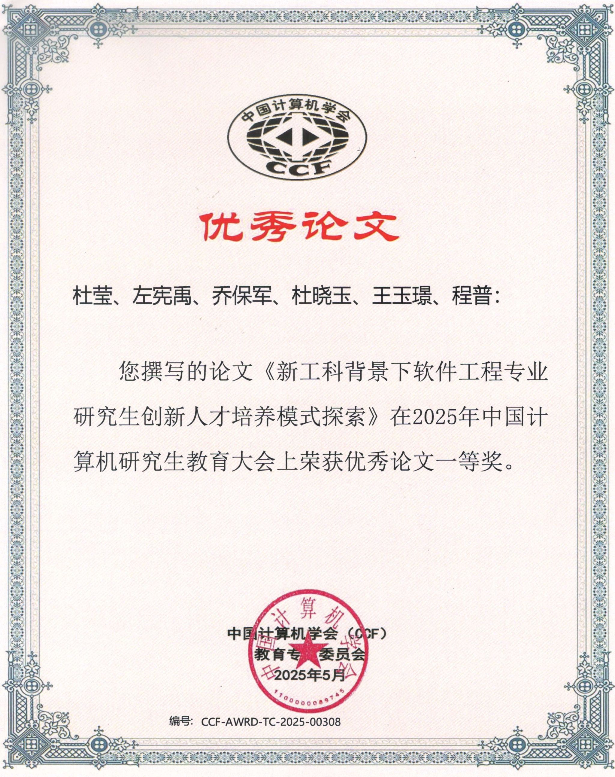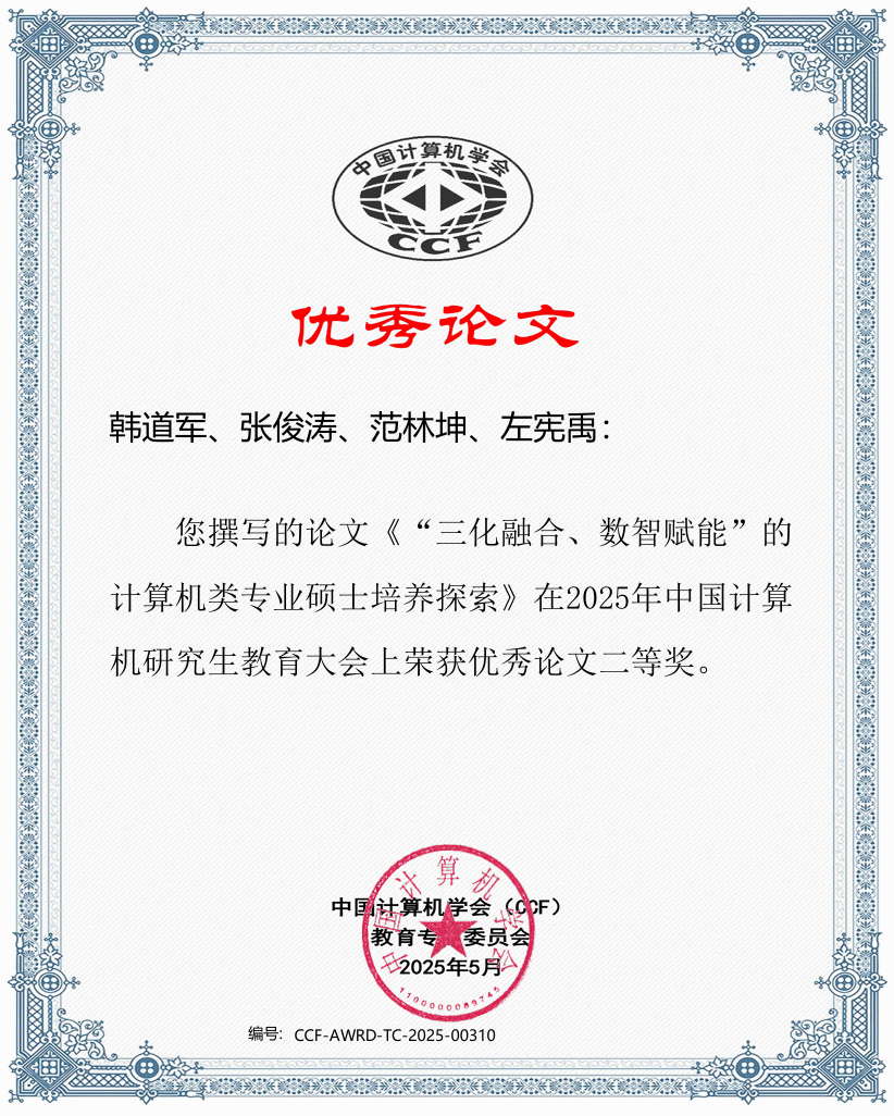 杜莹老师撰写的教学论文《新工科背景下软件工程专业研究生创新人才培养模式探索》获得大会优秀论文一等奖。韩道军老师撰写的教学论文《“三花融合、数智赋能”的计算机类专业硕士培养探索》获得大会优秀论文二等奖。据悉,本次大会共收到论文投稿131篇,大会录用论文82篇,录用率62.60%,其中一等奖10篇(7.63%)。