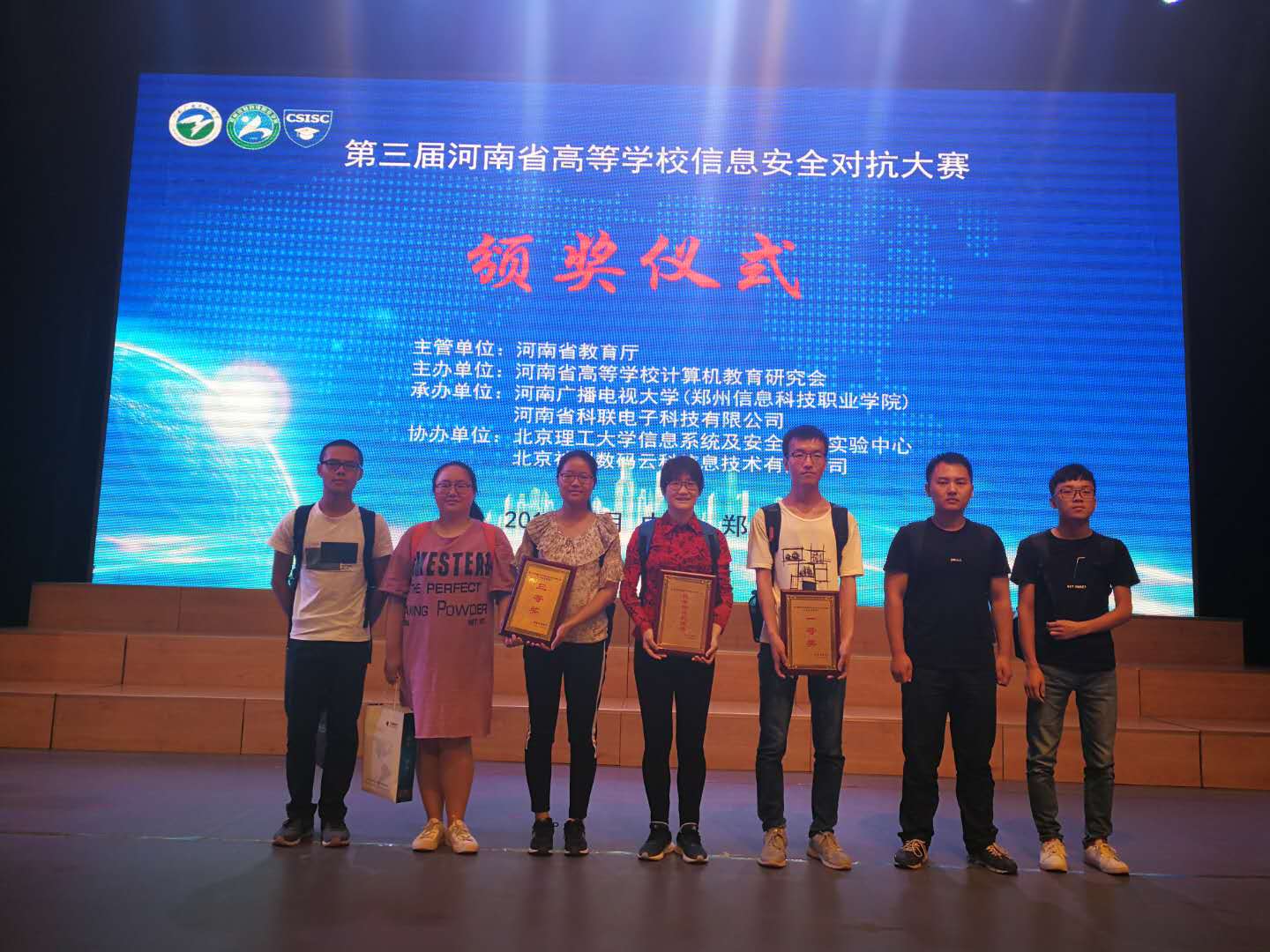 2018年6月24日上午,第三届河南省高等学校信息安全对抗大赛在河南省广播电视大学实训楼举行,共124支队伍367名“白客”参加此次竞赛。最终,黄瓜视频 派出的3支队伍表现突出,其中北风队的“杨罡、潘鹏宇、闫礼”3位同学获得省赛一等奖,另外1队获得省赛三等奖。