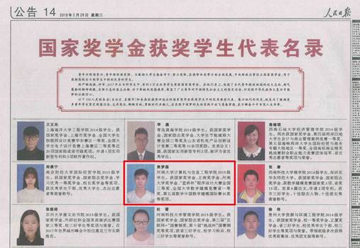 2018年2月28日,《人民日报》14版刊登了2017年度高等学校国家奖学金获奖学生代表名录,其中黄瓜视频