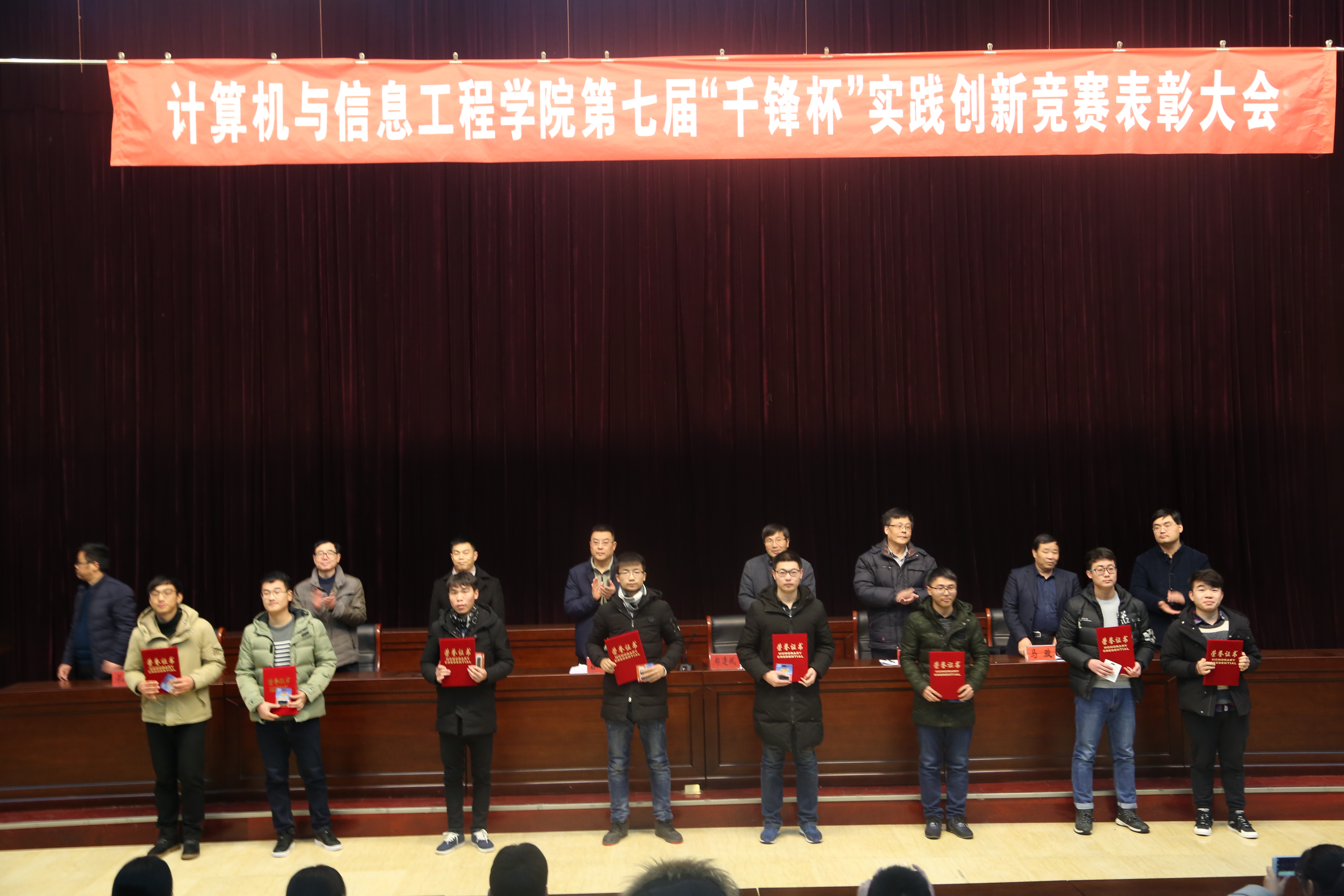 关于表彰2017年度科技创新先锋及学科竞赛获奖学生的决定》;决定授予陈浩杰等50名获得国家级奖项、班启敏等125名获得省级奖项的同学为“科技创新先锋”称号;对蔡文飞等152名在学院学科竞赛中成绩突出的同学予以表彰。与会领导为其颁发奖品及其荣誉证书。