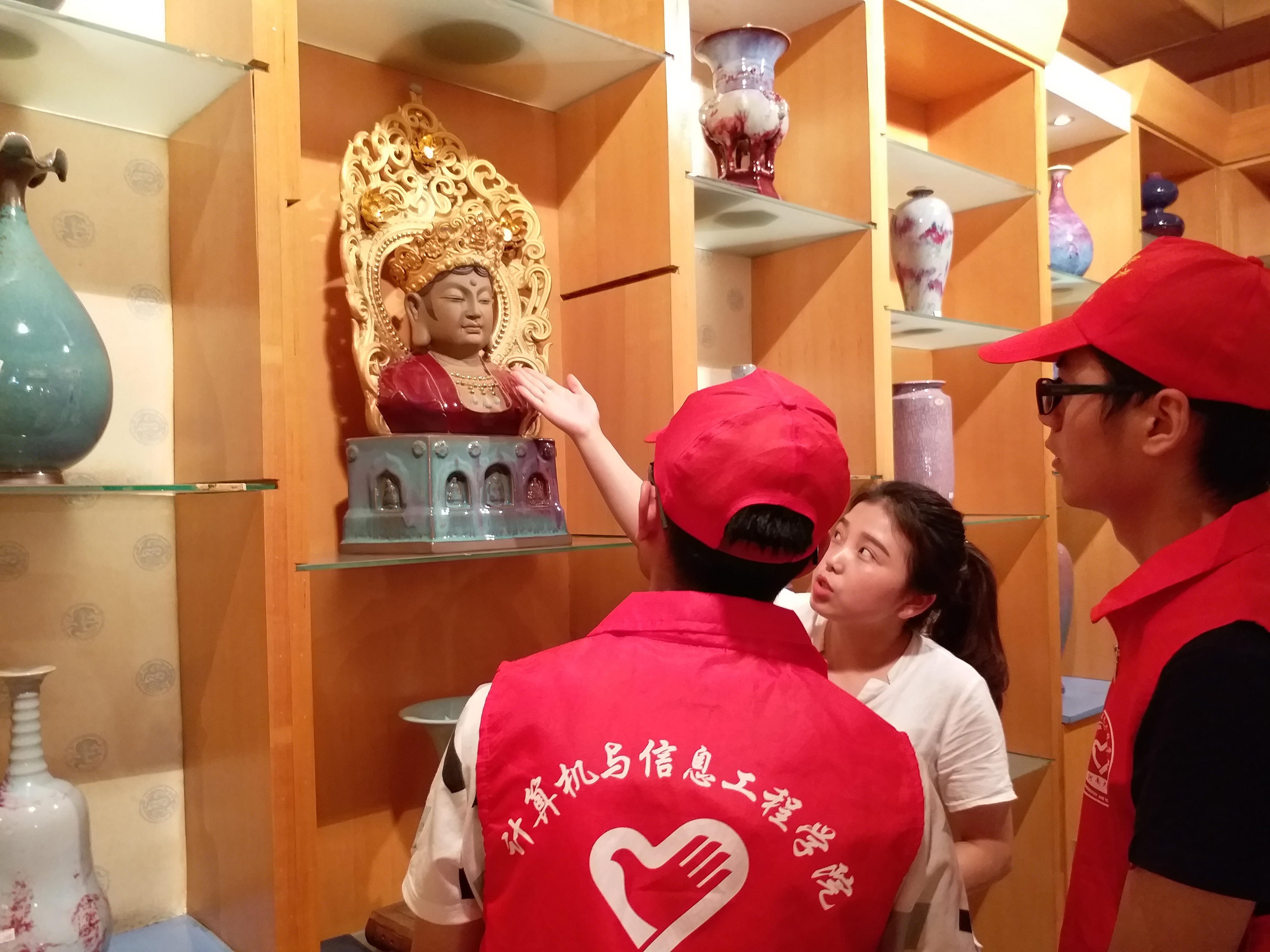 炎炎烈日下,“小红衣”们没有感觉到丝毫疲惫,马不停蹄地走往古镇的大街小巷,又进入到华鼎钧瓷进行学习实践。在这里,我们又观赏到了另外一种风格的钧瓷,色彩艳丽引人眼球。同时我们非常幸运遇到了华鼎钧瓷的创始人翟群大师,也看到了他和我校王立群教授的合影。翟群大师平易近人,细心地为我们讲解钧瓷花纹的变化,最后还亲切的与我们合影。