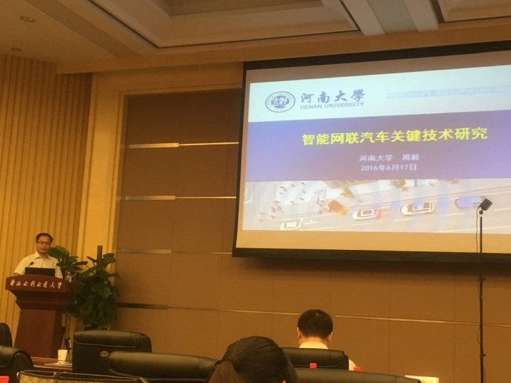 2016年6月17日,“河南省高校移动互联网应用开发研讨会”在郑州华北水利水电大学龙子湖校区四号报告厅举行。黄瓜视频 侯彦东、周毅、李伟及周林四位老师应邀出席会议,周毅代表学院在会上作了题为“智能网联汽车关键技术研究”的专题报告,介绍了黄瓜视频 “车联网协同技术”团队的基本情况和科研成果,分析了智能网联汽车的发展趋势和关键技术,并与业界人士进行了深入交流,讨论了虚拟现实、可见光通信等技术与智能网联汽车在移动互联应用上的潜在结合点。