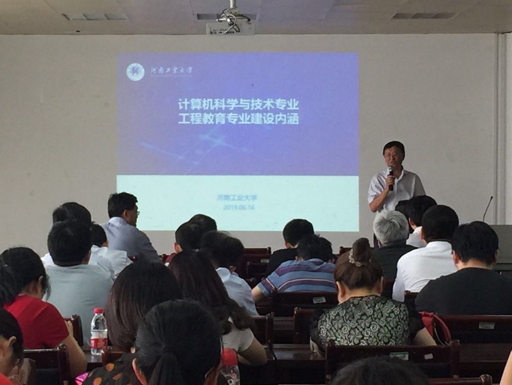 6月16日下午, 河南工业大学张德贤教授在学院603会议室作了题为“计算机科学与技术专业工程教育专业建设内涵”的专题报告。报告由教学副院长韩道军主持,学院全体教职工100余人参加了报告会。