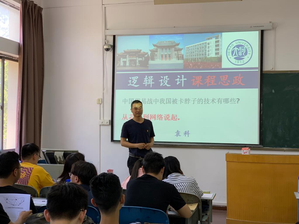 袁科老师在《数字逻辑》课堂上围绕“中国贸易战中我国被卡脖子的技术有哪些?”这个问题展开讨论。从“芯片”到“网络”,袁科老师以最近大家都关心的“中美贸易战”为引子,讲述了中兴缺“芯”事件,以及美国禁止向华为出口芯片事件。为大家陈述了一个沉痛但必须要了解的事实:“在多个IT领域,国产芯片占有率为0%”。让同学们痛定思痛,意识到国家拥有核心科技的重要性,认识到只有拥有了科技实力才能拥有保护自身的权利,才能不被别国欺辱的事实。他鼓励大家在新时代的国际竞争中,脚踏实地,勇于钻研与创新,以此来结束核心技术受制于人的局面,通过自身的努力来为祖国的建设出一份力。周珂老师以“信息学科的发展当前面临的机遇和挑战”为题,鼓励学生学好用好强大思想武器,抓住信息科学能力核心,发挥专业特色,将自身成长融入国家、社会发展大潮流,以解决实际问题为导向,以解决问题为学习方法,在实践中建功立业。陈国强老师在《数据结构》课堂中,展开以“社会秩序中的数据结构”为主题的系列讨论进课堂活动。陈老师结合我们社会文明秩序中的排队中的查找问题、游园路线安排、垃圾分类、交通路口的队列和栈等问题,运用算法时间复杂度分析和数据结构安排的合理性等评价指标,来说明社会讲文明、有秩序的社会主义核心价值观的重要作用,阐述公平也是效率,效率也是公平的理念。