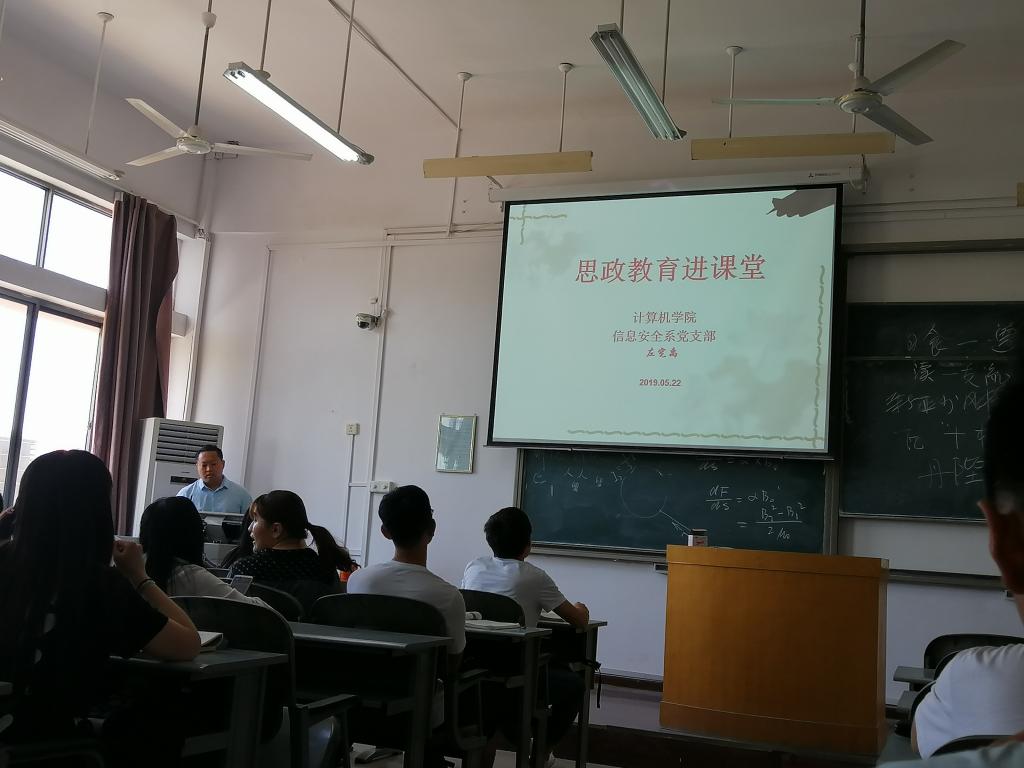 信息安全系教工党支部发起“党徽闪光芒,思政进课堂”活动月,组织了一系列别开生面的“思政教育进课堂”活动。老师们佩戴党员徽章上课,在课堂上将所讲专业课知识与习近平新时代中国特色社会主义思想、党的方针政策以及我国当前的经济、技术、时政热点等内容有机结合,让同学们能够在思想意识上认识到所学专业知识的哲学、时政背景,拓展知识面,更加认识到学习专业技术的必要性和紧迫性,更加奋发有为的成长为又红又专的新时代大学生。
