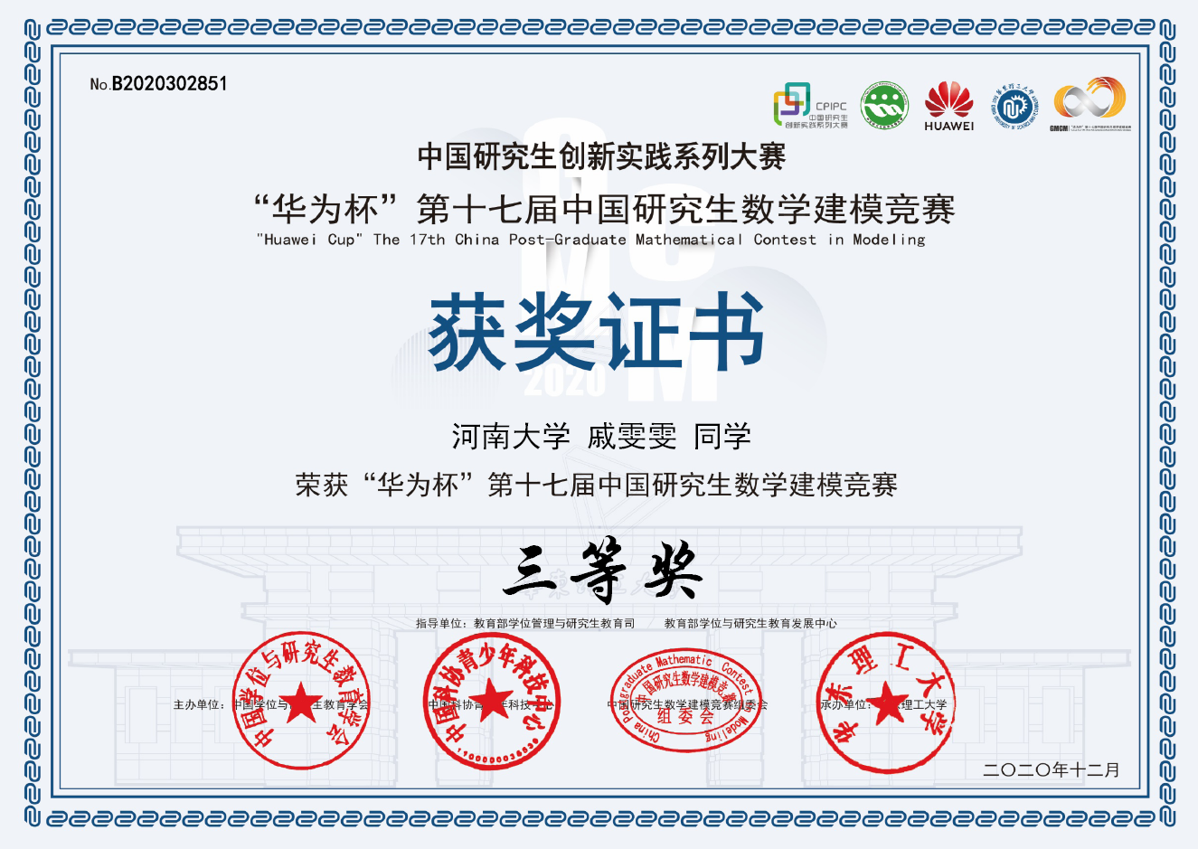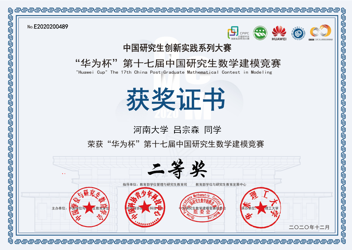 “华为杯”第十七届中国研究生数学建模竞赛于2020年9月17日-9月21日举行,该竞赛是中国学位与研究生教育学会、中国科协青少年科技中心主办的“中国研究生创新实践系列大赛”主题赛事之一,是一项面向在校研究生进行数学建模应用的学术竞赛活动,是广大在校研究生提高建立数学模型和运用互联网信息技术解决实践问题能力,培养科研创新精神和团队合作意识的大平台。竞赛采用限时方式完成赛题选择、赛题分析、数学建模、实验验证以及技术讨论等环节,并以论文形式提交完整解题解决方案。