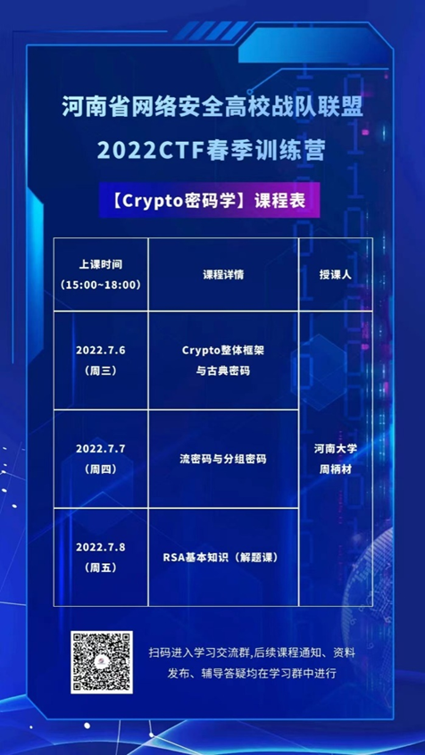 2020级信息安全专业本科生周柄材为河南省网络安全高校战队联盟2022CTF春季训练营开展了三次线上直播授课。