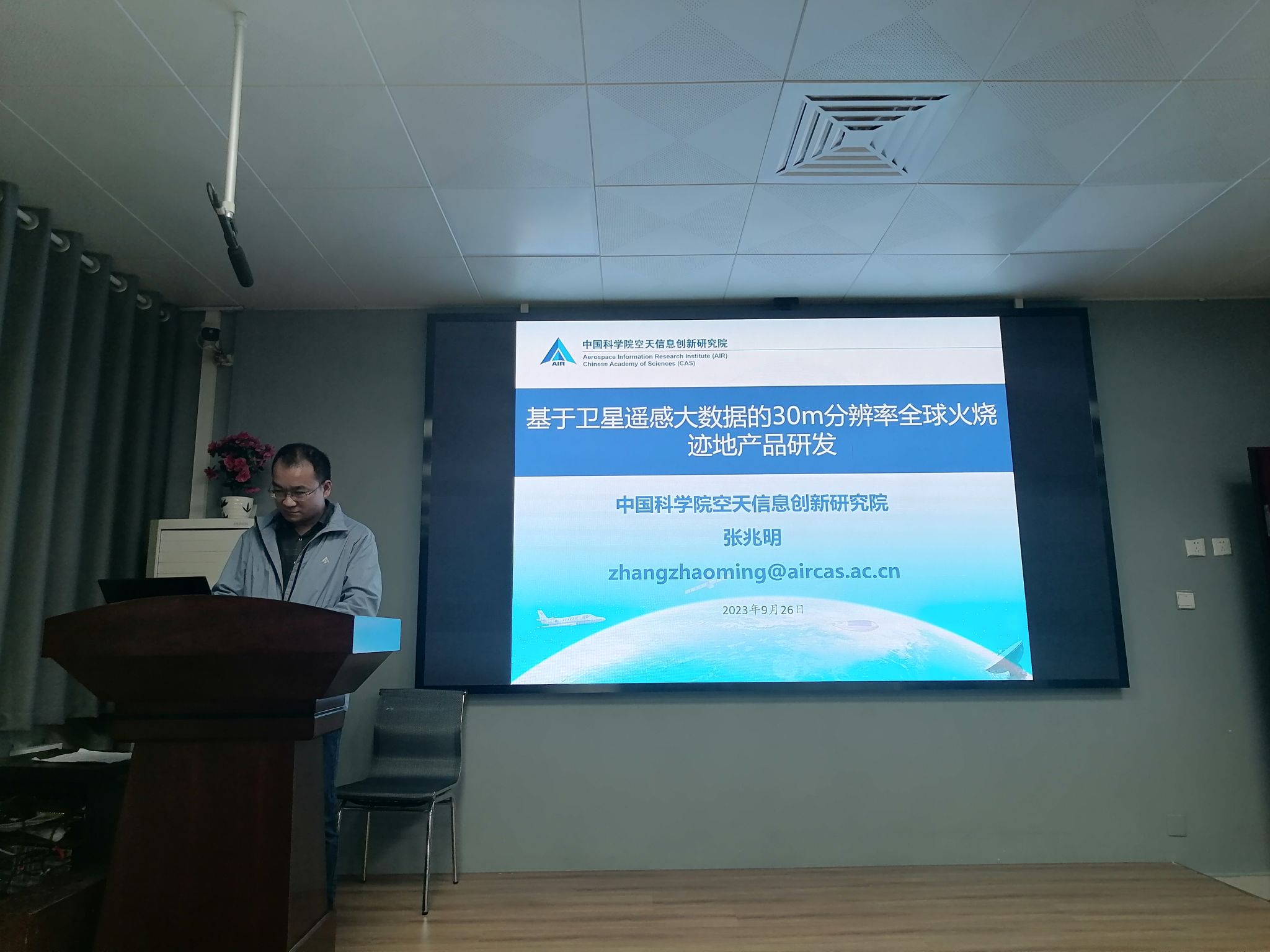 张兆明研究员首先对火烧迹地(植被被火烧毁后尚未恢复的土地)的概念进行介绍,并指出研发基于卫星遥感数据的全球火烧迹地产品的重要意义。在对国内外现有30米分辨率火烧迹地产品进行介绍后,张研究员从多样性、时效性和大数据三个方面分析了全球30米火烧迹地产品研发的难点,详细介绍了火烧迹地产品生产方法的各个环节,以及各类产品的精度分析和应用。
