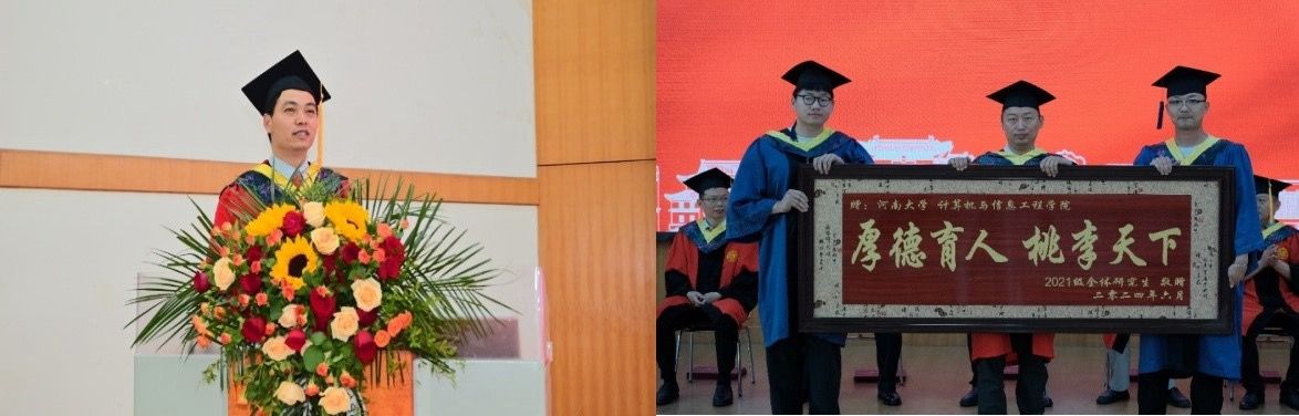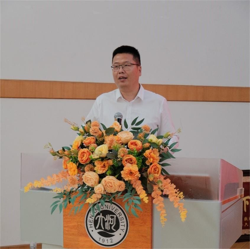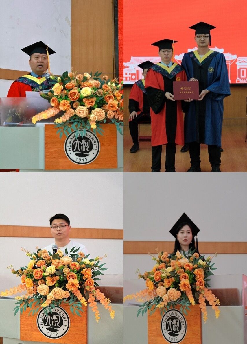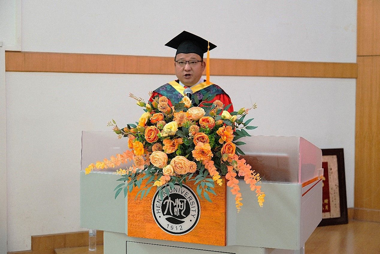 在校生代表2022级谈磊为毕业生送上了最热烈的祝贺和最真挚的祝福。他回顾了学长学姐们在河大度过的一千多个日夜,每一刻都充满了奋斗和拼搏,感谢他们用实际行动为在校学弟学妹们做出了最好的榜样,并留下了丰富的精神财富,表示在校生们会沿着他们的足迹继续前行,传承他们的精神,为学校学院繁荣发展贡献自己的青春力量。