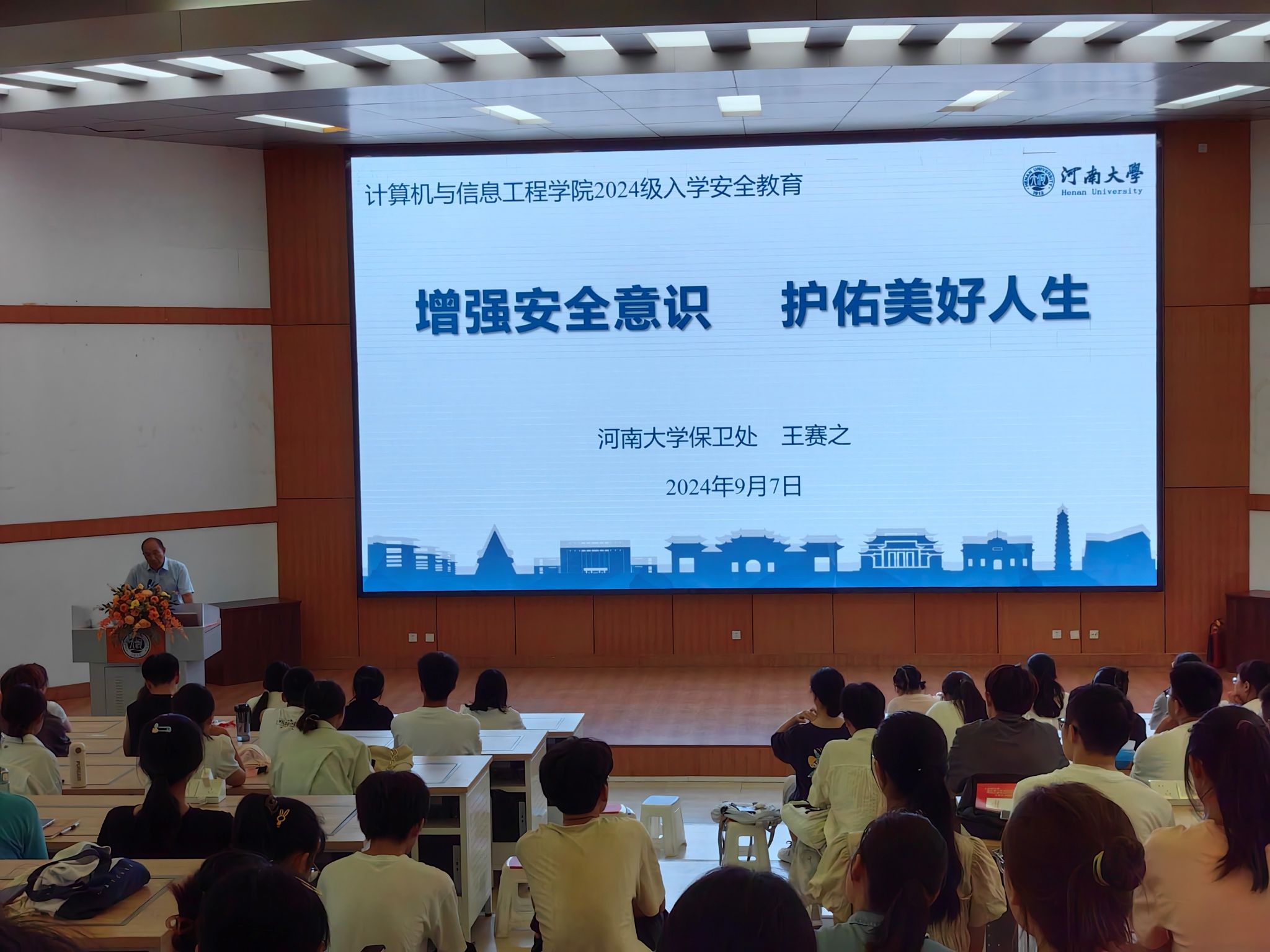 9月7日下午,学校保卫处副处长王赛之做“增强安全意识 护佑美好人生”主题讲座。没有安全,就没有了一切,王赛之从人身安全、财产安全、交通安全、集体活动安全、消防和饮食卫生安全等方面进行了常识教育,对新生开展防火、防盗、防诈骗、防传销等宣讲,旨在提高学生安全防范意识及突发事件应对能力。