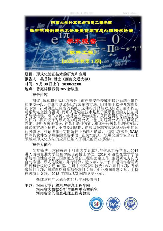 ,2014进入西南交通大学信息学院攻读博士学位,2019年留校在数学学院系统可信性自动验证国家地方联合工程实验室工作。主要研究方向为自动推理、形式化验证、并行计算。近5年,以一作和通讯作者发表期刊和会议论文近10篇,主研中央军委科技委H863项目1项,省部级项目1项,国家自然科学基金项目2项,企业横向课题2项。主持校级项目2项。2018年国际SAT问题竞赛亚军。