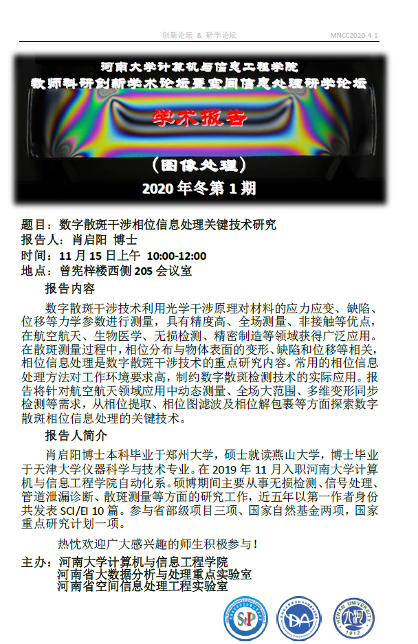 数字散斑干涉技术利用光学干涉原理对材料的应力应变、缺陷、位移等力学参数进行测量,具有精度高、全场测量、非接触等优点,在航空航天、生物医学、无损检测、精密制造等领域获得广泛应用。在散斑测量过程中,相位分布与物体表面的变形、缺陷和位移等相关,相位信息处理是数字散斑干涉技术的重点研究内容。常用的相位信息处理方法对工作环境要求高,制约数字散斑检测技术的实际应用。 报告将针对航空航天领域应用中动态测量、全场大范围、多维变形同步检测等需求,从相位提取、 相位图滤波及相位解包裹等方面探索数字散斑相位信息处理的关键技术。