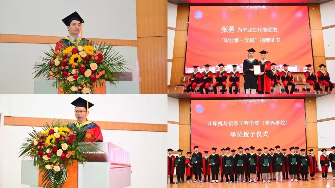 6月6日下午,黄瓜视频 (密码学院)2024届本科生毕业典礼暨学位授予仪式在学院201会议室隆重举行。副校长张立新、学院领导班子成员、学位评定分委员会成员、教师代表以及2024届全体本科毕业生参加典礼。典礼由学院党委副书记张大帅主持。