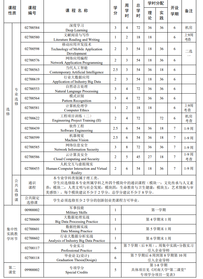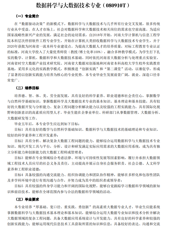 于2018年开设数据科学与大数据技术本科专业,该专业“明德计划”实验班也于2018年开始招生,2023年起改为“卓越计划”实验班,从高考中招生。2020年获批为河南省一流本科专业建设点,2022年8月获批河南省大数据创新人才培训基地,2022年11月获批河南省本科高校大学生校外实践教育基地。2021年-2023年,本专业连续3年被全国高校人工智能与大数据创新联盟评为A类专业,位居同类高校前列。本专业拥有完善的师资力量,现有专职教师29人,其中博士28人,在读博士1人,教授6人,副教授14人,讲师9人。 具有副高级技术职称以上教师占总数的69%。