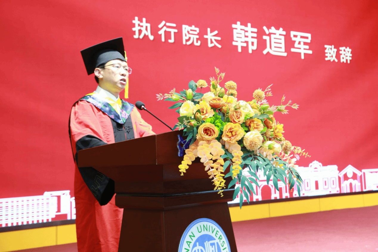 韩道军在致辞中对毕业生们表达了最美好的祝愿和最真诚的期望,希望同学们能够勇担复兴使命和历史重任,善良做人做事。并以《西游记》中“扫塔辩奇冤”的故事为引,给同学们提供四点哲理启发。一是“起点低”,希望同学们将来无论从事哪一个行业,都要认认真真从基础做起,从小事做起;二是“当下净”,以“唐僧扫塔由下往上致灰尘反复落,狗熊掰棒子掰一个扔一个”等形象比喻激励同学们人能把握的唯有当下,做好每个当下人生才有意义;三是“回头脏”,在走上更高台阶后发现来时路变脏,指出这是进步的体现,进步会让人看到自身不足,希望同学们一定要学会回头看,反思自己,改正自己,才能不断更新,不断前行;四是“平常道”,希望同学们专注当下,凡事在事上练,工作也是一种修行