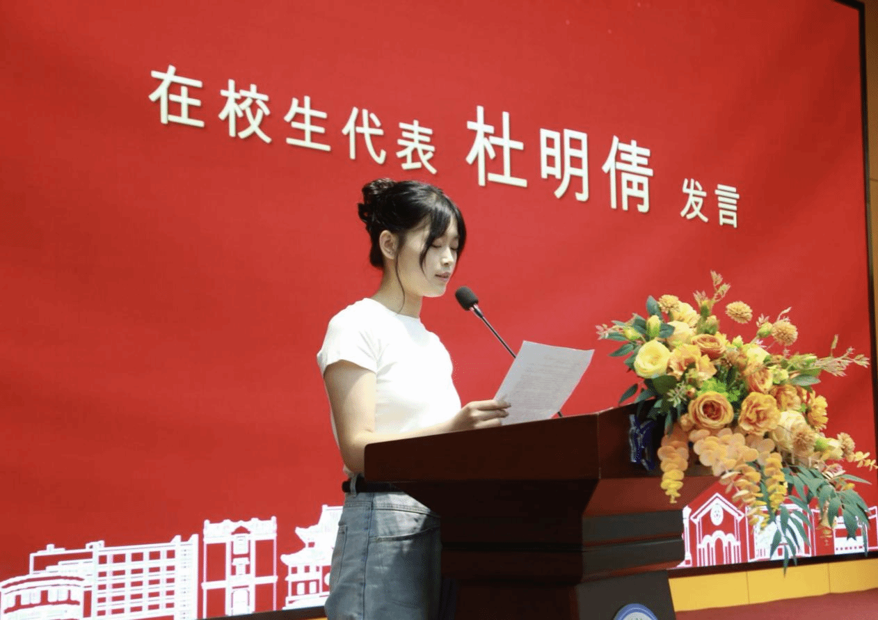 在校生代表2023级杜明倩向学长学姐表达了衷心感谢,感谢他们曾经给予的帮助与支持。也携着在校生们的深深眷恋与美好期许,为学长学姐们献上最美的祝福与诚挚的祝愿。