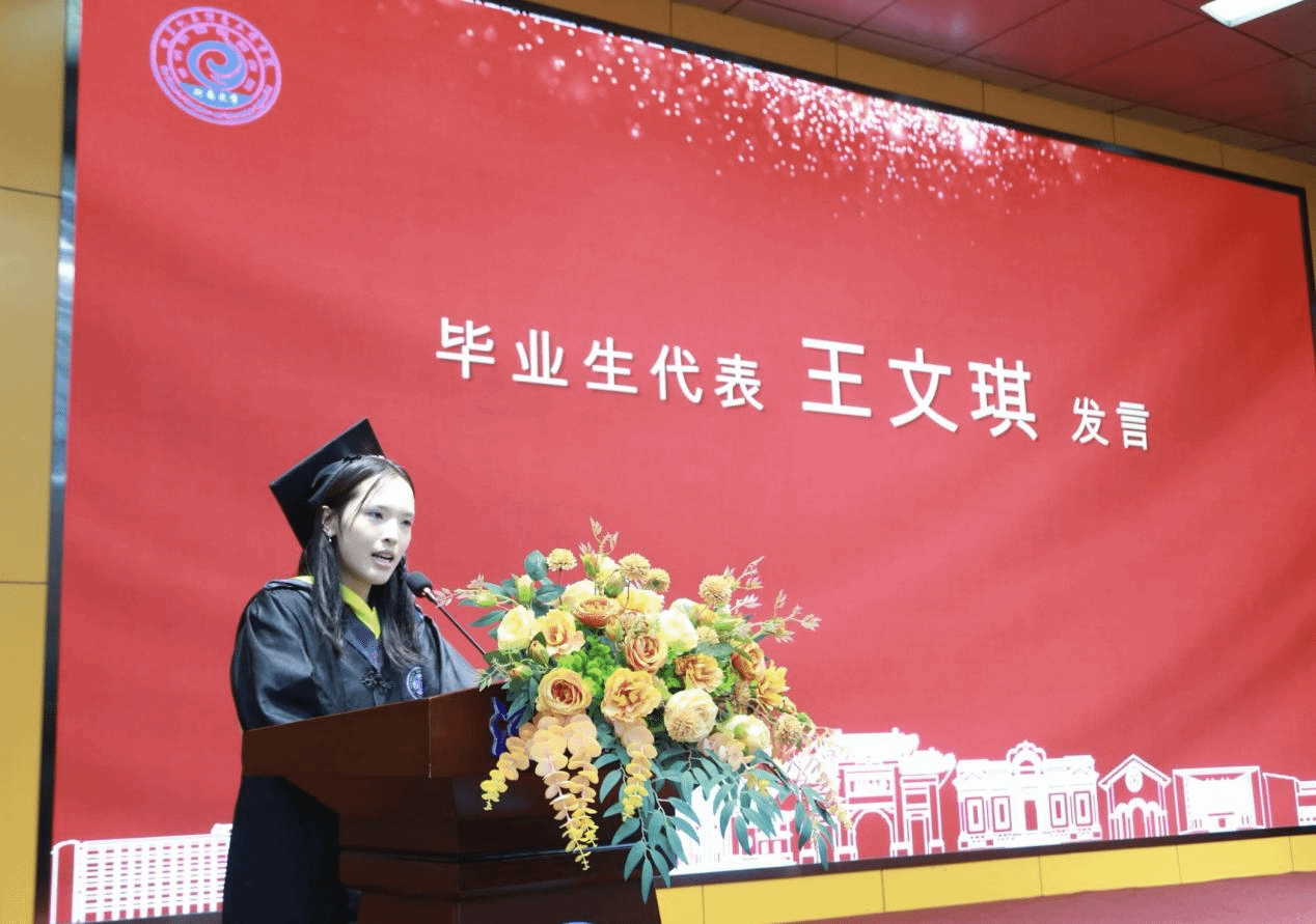 毕业生代表2021级王文琪在发言中回顾了大学生活的点点滴滴,对四年来学校、学院和父母家人的倾心培养表达深深的谢意,并号召大家以“铁塔牌”学子的身份认同为纽带践行专业精神,担当社会责任,做有温度、有担当的青年!