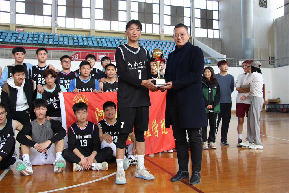 颁奖仪式在全场的欢呼声中拉开帷幕,双方队员毫无芥蒂互相击掌拥抱,体育学院院长周珂为获胜队伍颁发奖杯并合影留念。在本次比赛中,各个学院都赛出了风格,赛出了水平,不但丰富了同学们的课余文化生活,还进一步增强了学生的凝聚力和向心力,充分展现了河大学子顽强拼搏的青春风采和“友谊第一比赛第二”的体育精神。
