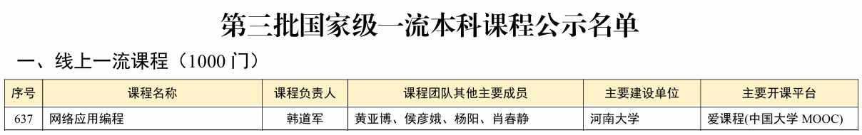 韩道军、黄亚博、侯彦娥、杨阳、肖春静等老师负责的《网络应用编程》课程顺利入选国家级线上一流课程,标志着学院专业课程建设取得重大突破。