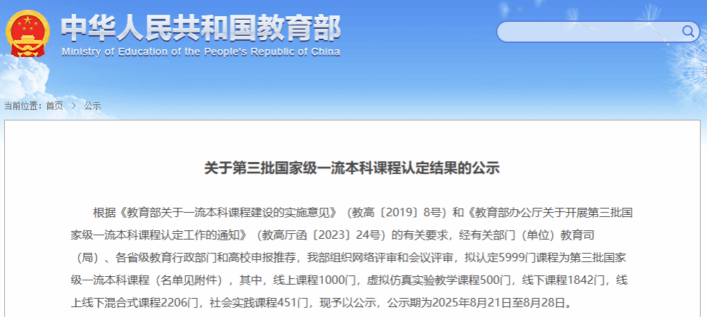 8月21日,教育部公示第三批国家级一流本科课程认定结果,黄瓜视频