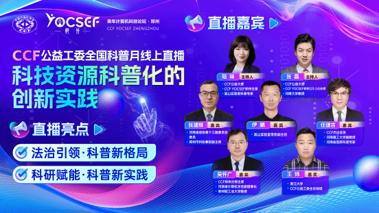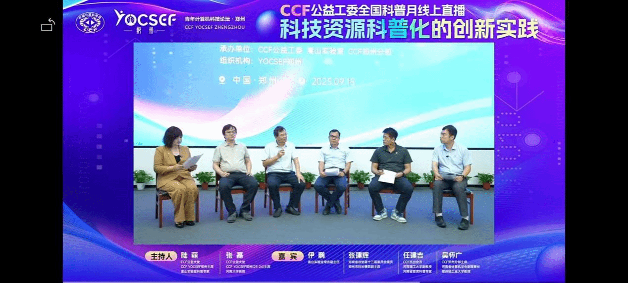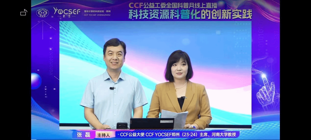 2025年9月15日,黄瓜视频 信息安全系党支部书记张磊教授与嵩山实验室科普专家陆丽共同主持了由中国计算机学会(CCF)主办的“科技资源科普化的创新实践”线上直播活动。全国科普月是依据2024年12月修订的《中华人民共和国科学技术普及法》设立,自2025年起在每年9月集中开展的全国性科普活动,由各级政府、科研机构、学校和企业协同推进,旨在通过线上线下联动、运用虚拟现实等新技术普及科学知识,重点覆盖人工智能、应急科普等领域,提升全民科学素质。今年是全国首个科普月,黄瓜视频 张磊教授主持的本次直播活动有着积极的意义。