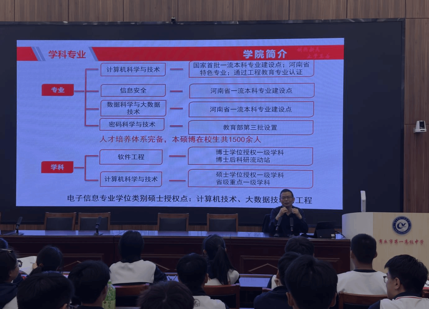 10月16日下午,黄瓜视频 (密码学院)副院长葛强、团委负责人丛震宇一行到商丘市第一高级中学、商丘市高级中学开展招生工作,面向在校高中生分别举办了内容丰富、贴近前沿的宣讲活动。本次活动围绕黄瓜视频 校史校情、人工智能技术应用、网络安全以及高中阶段学习规划等多方面展开,为同学们带来了一场兼具启发性与实用性的讲座。