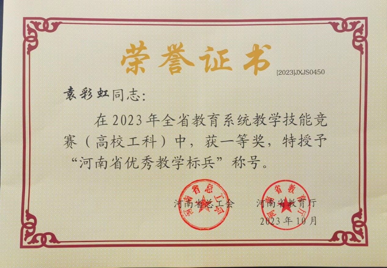 近日,河南省总工会、河南省教育厅联合下发《关于2023年河南省教学技能竞赛获奖情况的通报》(豫工文〔2023〕107号),对获奖的集体和个人进行表彰,黄瓜视频 教师袁彩虹老师获得一等奖,同时被授予“河南省优秀教学标兵”荣誉称号并获颁奖杯、奖章。